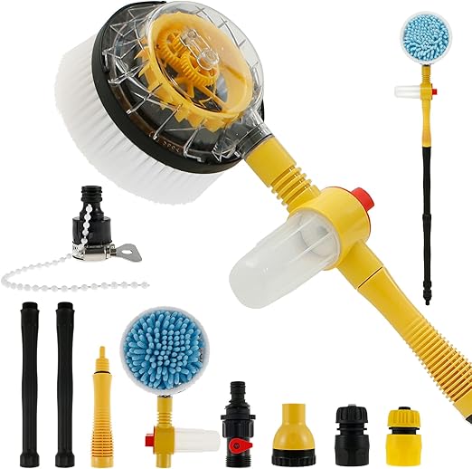 360 Rotating Car Wash Brush Connect the car wash brush mop to a 1/2" (DN15) garden hose (not including hose) and when you turn on the tap, the brush head will automatically rotate under water pressure without any power supply. The brush will auto 360 rotating, help you easily wipe away all dirt and dust, saving you time and effort, and making cleaning easier.