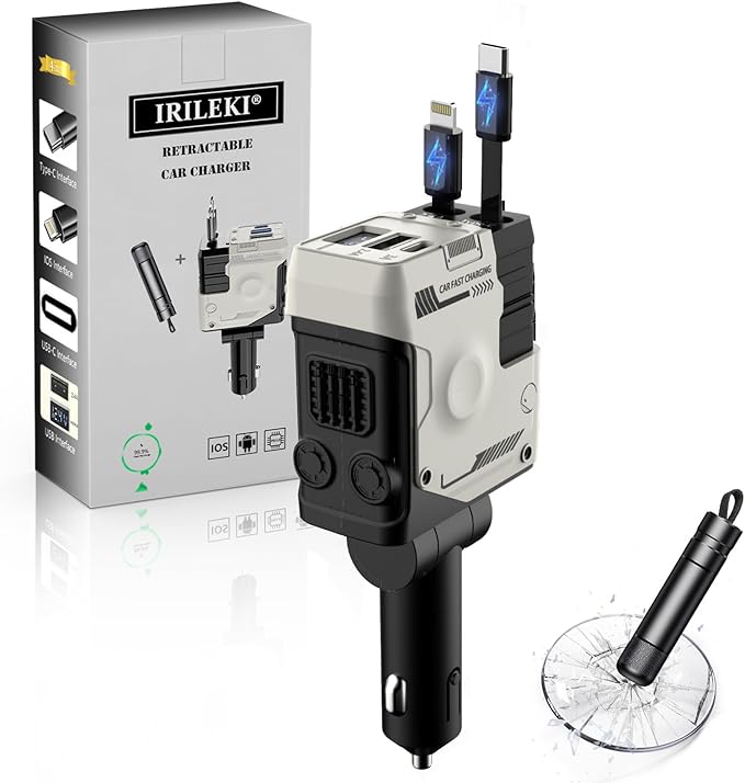 • Upgraded 4-in-1 Charging The IRILEKI car charger is designed to power up to four devices simultaneously, offering 2 retractable lightning cables, USB-A and Type-C ports. This avoids having to carry multiple cables and chargers during your trip.