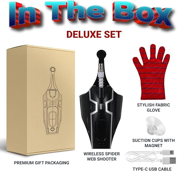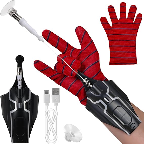 Unleash your kids inner hero with this amazing web shooter pack! Which child, and the child in many of us, hasnt dreamed of swinging into spider hero adventures? Who hasnt imagined the excitement of shooting a web from their wrist to catch the bad guys and restore peace? At long last, you can finally bring this fantasy to life with the one and only Joyful Juniors Web Shooter Cosplay Kit! Designed for the young and the young at heart, this string launcher is where excitement meets creativity. Take a look at what makes our web shooter a must-have It has realistic look and play for an authentic action hero experience Lightweight at only 3.5oz, with a durable & comfortable silicone wristband Has over 8 range with magnet & suction cup tips to attach to different surfaces Features a one-button auto-retraction system thats USB-rechargeable Enjoy a sleek, all-black incognito design befitting a hero in disguise Includes extra magnets, screwdriver & charging cable for a full kit Whats more, every web launcher spider string shooter toy pack comes with a matching red glove to complete the superhero look. Whether its for a backyard adventure or a theme party, our web-shooters are perfect for spider action fans, role-play enthusiasts, and anyone over 6 years old who loves engaging, imaginative fun. Get ready to add endlessly exciting adventures to your childs playtime, and get our peace of mind 30-day warranty at the same time. Dont wait! Swing into action and grab your web gadget pack right now!